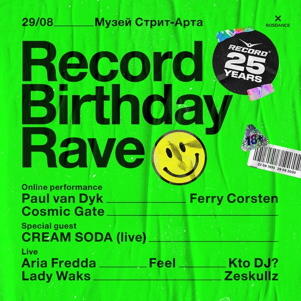 Радио Record отметит 25-летие в формате рейва Есть множество причин, почему мы должны были отменить празднование 25-летия Рекорда в этом году. Но мы не смогли отказать вам и себе в желании сделать тусовку века после карантина!29 августа Первая танцевальная радиостанция страны отметит свой юбилей настоящим рейвом на открытой территории Музея Стрит-арта. Показать полностью…Рейв пройдет в формате live+online. Иностранные артисты, которые пока не могут свободно въехать в Россию из-за закрытых границ, отыграют свои сеты по телемосту на огромном экране. Резиденты Радио Record и российские звёзды выступят на сцене вживую. Online: Paul Van Dyk, Ferry Corsten, Cosmic Gate. Live: Feel , Zeskullz , Kto DJ?, Lady Waks. Специальным гостем рейва станет феномен российской танцевальной сцены — группа Cream Soda с полноценным живым концертом.Посетителям рейва будет необходимо соблюдать социальную дистанцию не менее 1,5 метров и пользоваться масками.Билеты от 1000 рублей: vk.cc/axZjofВстреча мероприятия: vk.com/radiorecordbirthday